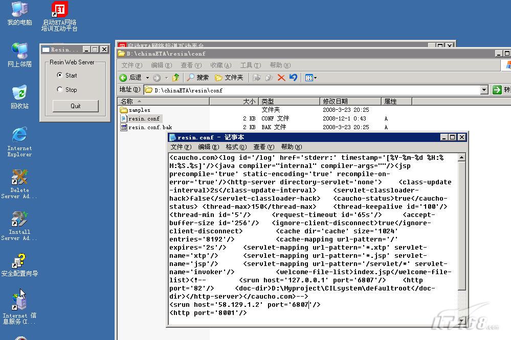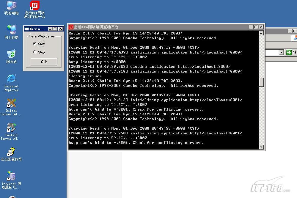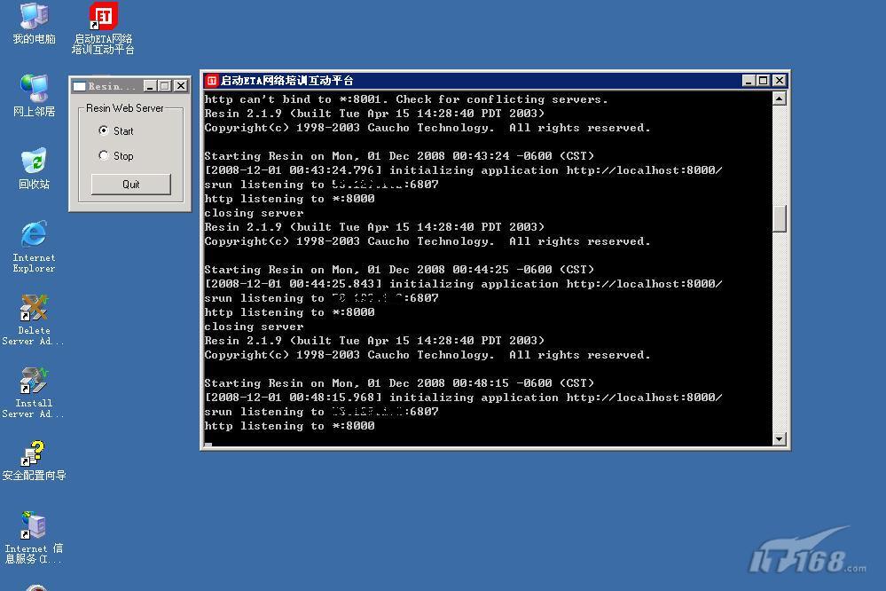 这个资源平台使用的是resin发布页面,平台是通过JAVA编写完成的。查询resin运行状态时本人发现反复出现诸如http cannot bind to *:8001,check for conflicting servers的提示。由于我对JAVA和服务器配置不太熟悉,所以向IT168专家求救希望能够帮助我解决这个难题,否则这个资源平台名存实亡根本无法顺利为学校内部用户提供服务。(如图1)