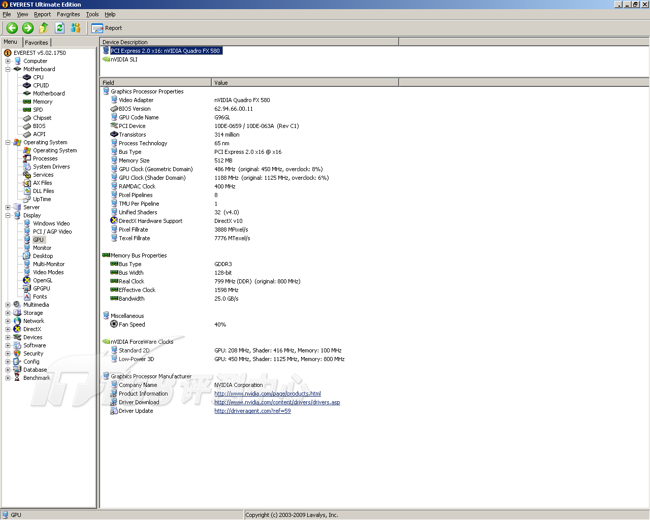 本次测试使用的Quadro FX580显卡是Quadro 10代的低端产品,测试驱动为ForceWare 182.65。