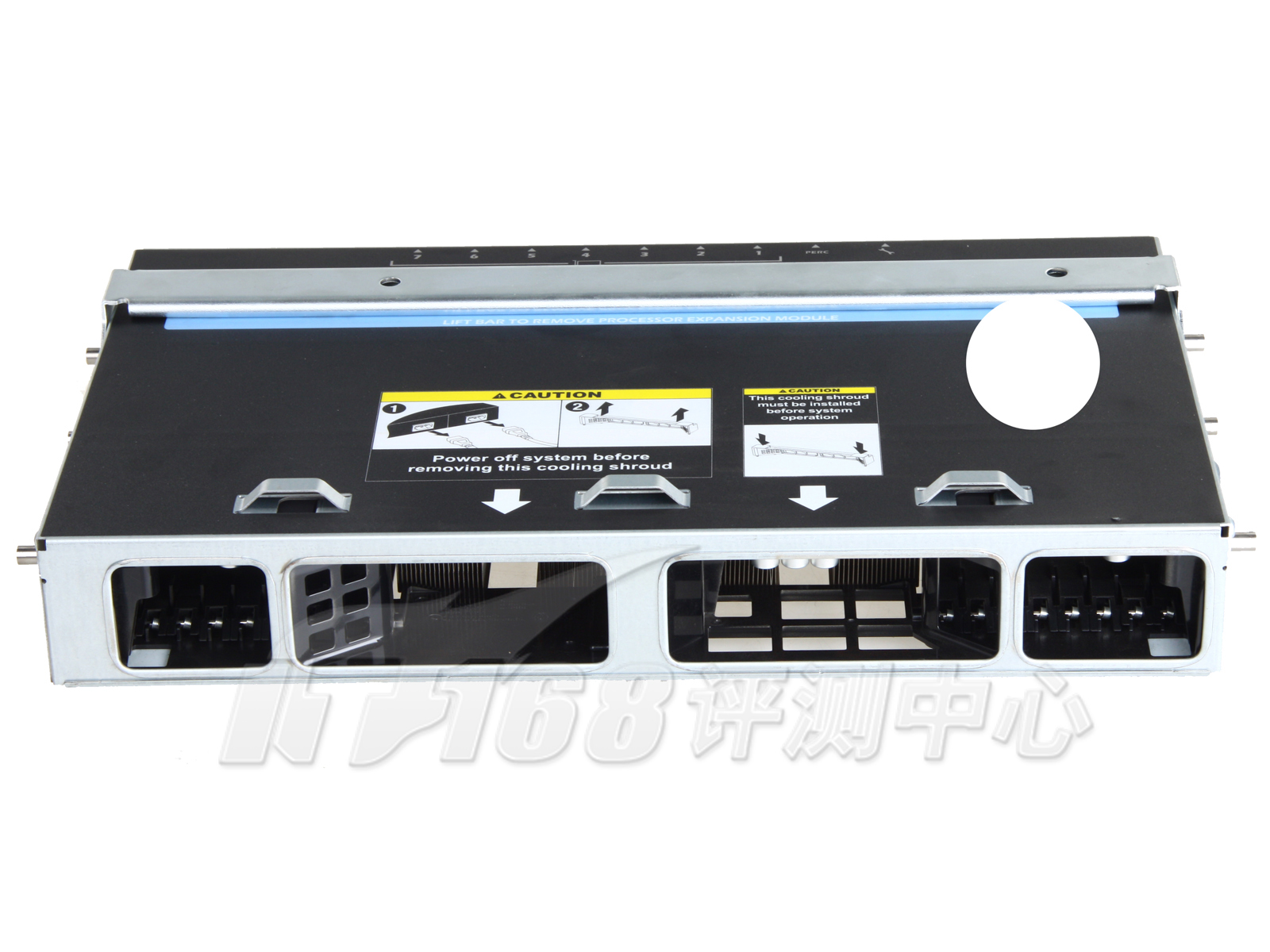 我们先来介绍一下R905内部的散热设计。通过前面板的散热孔,气流进入机器内部,之后有两排共4个12CM风扇作为系统整理散热,通过导风罩为处理器、内存及后面的阵列卡等配件服务。如图,所有的风扇都使用的是模块化设计,方便插拔。