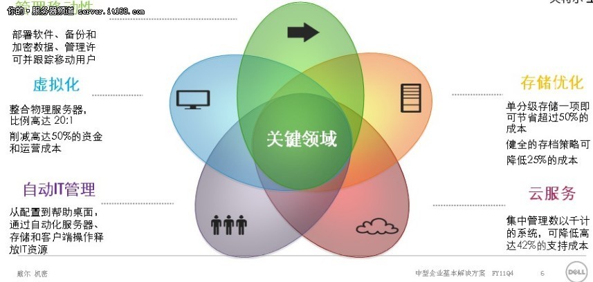 针对这一系列的难点,许多厂家也提供了解决方案。例如,Dell就专门为建设高效企业提供了一整套解决方案和思路,其中包括服务器虚拟化、存储优化、IT自动管理等等,同时还推出了精彩的在线培训视频教程,详情请见:http://dellwebinar.khimkt.com/curriculum.jsp。