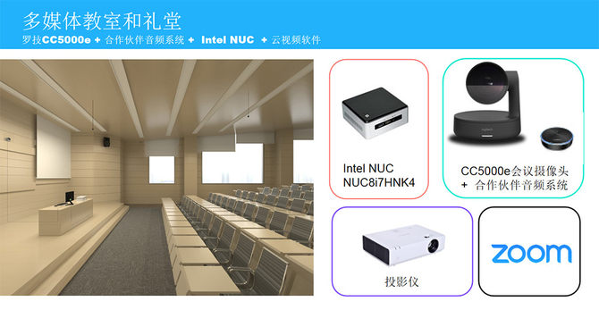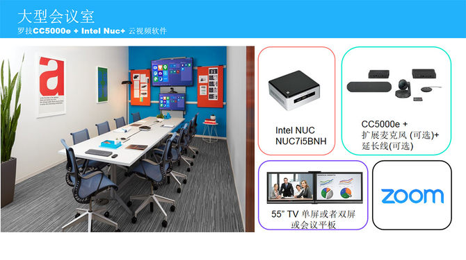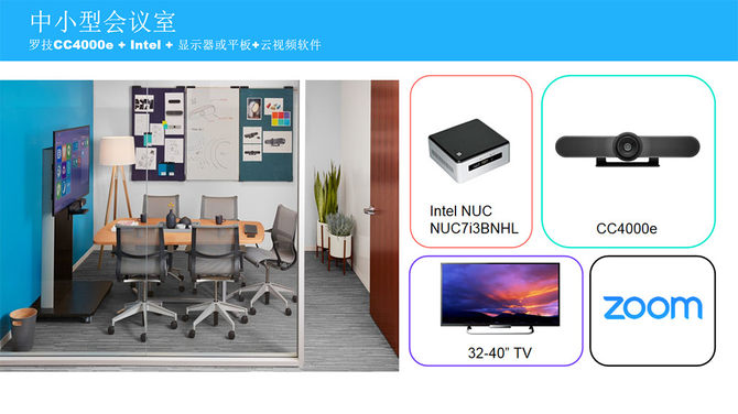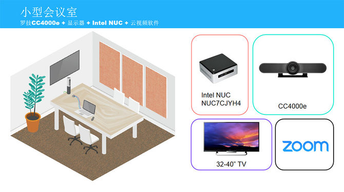 那么上面这些优点是如何实现的呢?以ZOOM为例,这套解决方案选用视频会议专用摄像头作为USB音视频设备,通过USB接口即插即用连接到英特尔NUC迷你主机,再打开安装于NUC主机上的ZOOM等云视频会议专用软件即可享用流畅视频会议。
