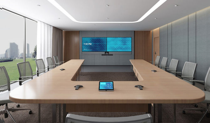 在小型会议室中开会难免会遇到以下问题:摄像头视角不能看到屋内的每个人,存在视觉盲区,桌面正中麦克风收音效果差,连接设备多,占用本来就小的会议室桌面空间。这些问题严重影响着开会效率,如今只需在该方案的基础上加入广角摄像头等专业设备,问题便得以解决,同样可根据会议室具体空间大小情况来调整外设来达到非常好的的体验。