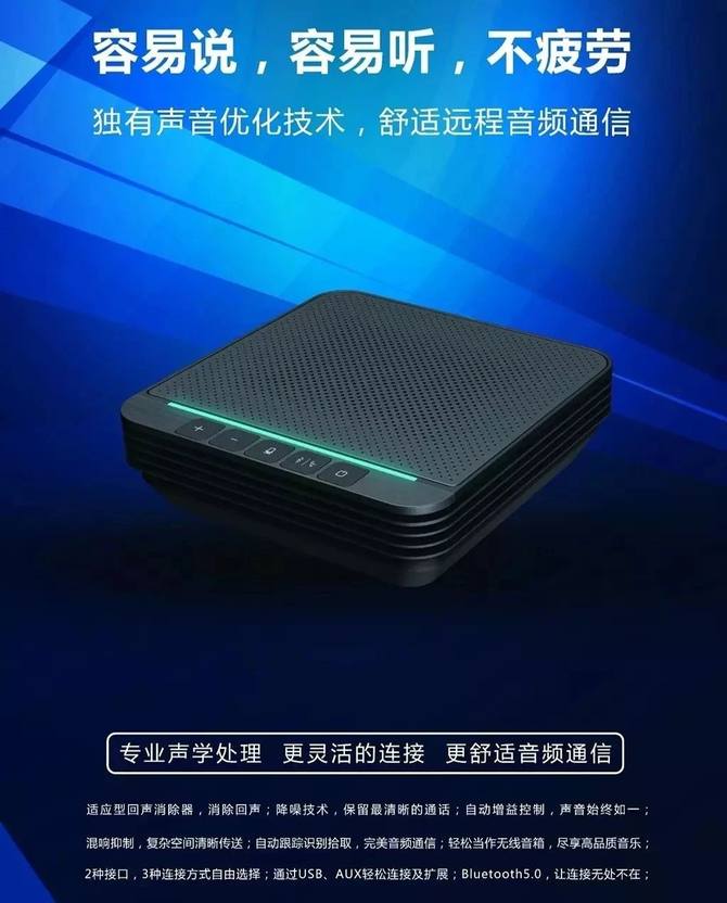 VC200麦克风独有的声音优化技术,让远程音频通信更舒适。VC200让连接更加自由灵活,支持USB、蓝牙、AUX2种接口和3种连接方式,内置大容量锂电池,最长通话10小时待机长达3个月。
