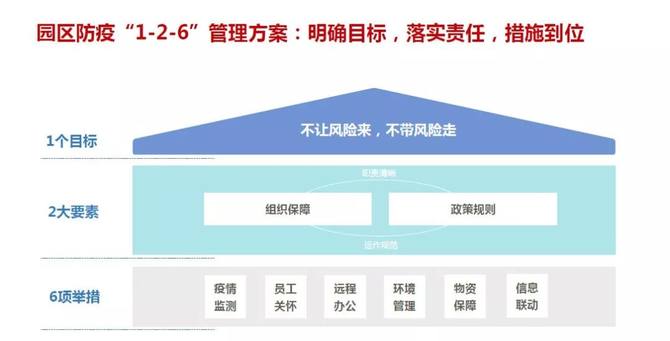 据朱伟柱介绍,华为智慧园区疫情防控解决方案制定了“1-2-6”管理方案,即1个目标、2大要素、6项举措,从而实现明确目标,落实责任,措施到位的效果。