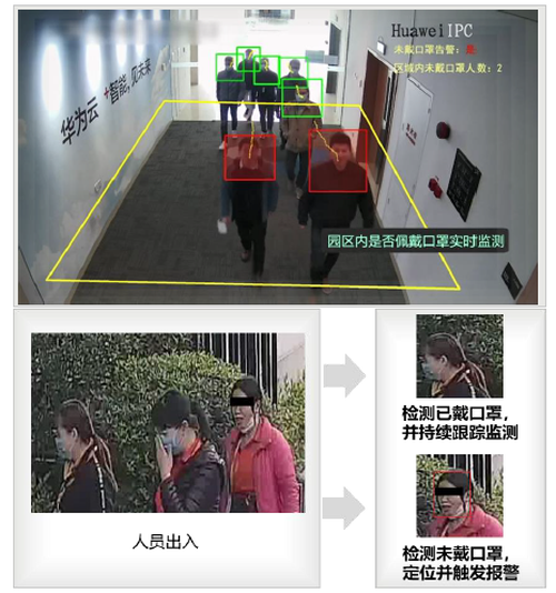 口罩检测:及时告警,7*24小时守护园区疫情监测。戴口罩是必需的防控手段,对于因某种原因未戴口罩的极个别人员,利用边缘计算和AI视频分析算法,有效识别未戴口罩人员,智能定位并触发告警。