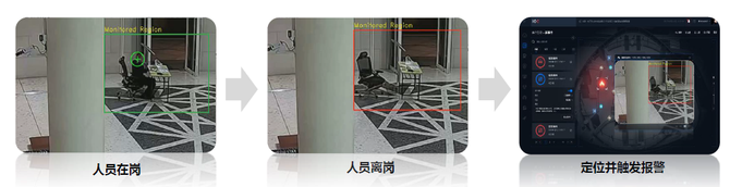 离岗检测:保障关键岗位尽职尽责。特殊时期的门岗、食堂等关键服务岗位管理更为严格。华为园区对关键岗位人员进行智能在岗检测,通过视频巡逻替代人工巡视,大幅提高管理效率,并杜绝“亲密”接触。