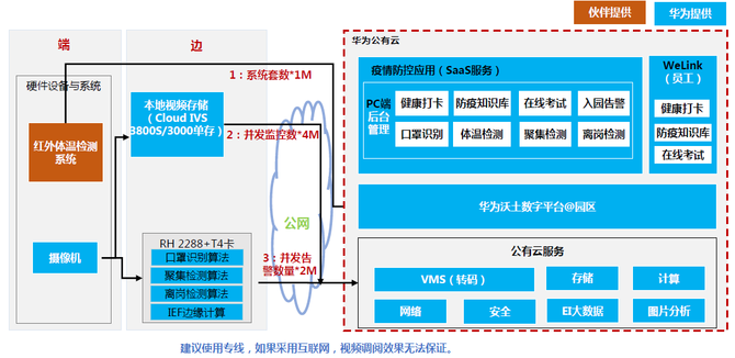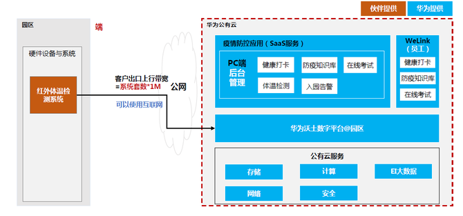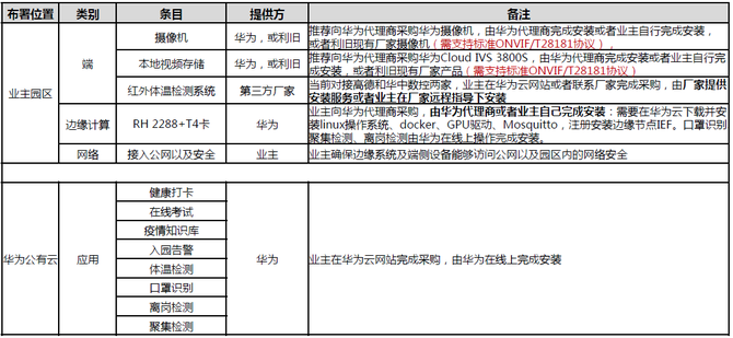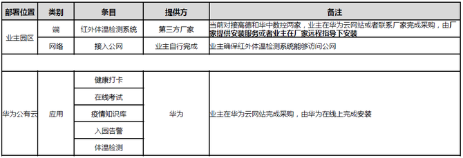 说明:目前市面上大部分红外体温检测系统都满足华为接口要求:restful接口,上报体温、红外成像图片、可见光成像图片等。如果业主需要指定其它品牌红外体温检测系统,建议推动厂家完成与华为云对接后再下单。