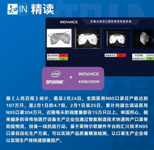 基于英特尔软硬件平台的汇川技术N95口罩自动化生产方案,引入AI深度学习技术,只要4个工位,就可以实现产品质量精准检测,让口罩生产企业得以实现生产线快速部署投产,全自动产线24x7高效运转,产品质量检测岗位无需人工,云边协同实现远程监控和管理,全方位确保企业安全且高效生产,为一线医护人员提供合格的防护屏障。