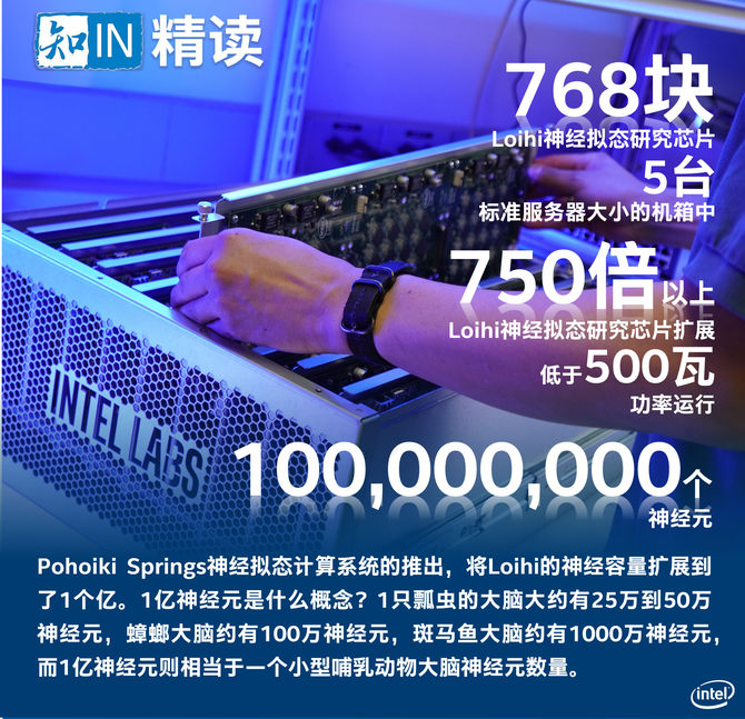 Pohoiki Springs是一个数据中心机架式系统,是英特尔迄今为止开发的最大规模的神经拟态计算系统。它将768块Loihi神经拟态研究芯片集成在5台标准服务器大小的机箱中。