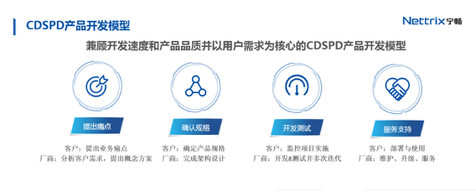 在R620通用产品基础上,依托宁畅CDSPD产品开发模型,从接到客户需求到架构设计、迭代开发测试,每个环节都实现了精细设置,可极大缩短产品交付时间并降低用户TCO(总体拥有成本)。