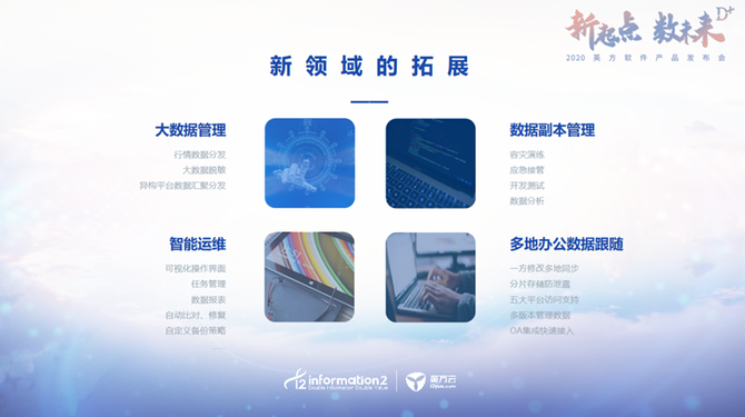 10 月 23 日,领先的数据复制基础软件企业英方软件,成功举办以“ D+ 新起点·数未来”为主题的“2020 英方软件产品发布会”。除了发布“大数据管理、数据副本管理、智能运维、多地办公数据跟随”等新领域成果,英方软件在过去 10 年数据复制核心技术和产品的基础上,提出围绕不同行业用户的数据保护、管理和业务需求,以 Data+ 为用户提供个性化服务的新战略。