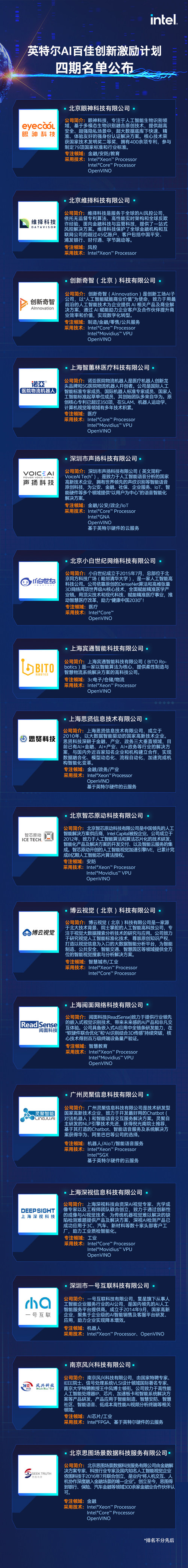 随着影响力的逐步提升,更多的行业领军企业加入到计划中,例如全球知名的AI风控公司北京维择科技有限公司,具有生物识别融合原创技术的北京眼神科技有限公司,中国人工智能产品及解决方案主流供应商创新奇智科技有限公司等等,他们将依托英特尔全面的产品技术和丰富的生态资源,打造更领先的智能解决方案。