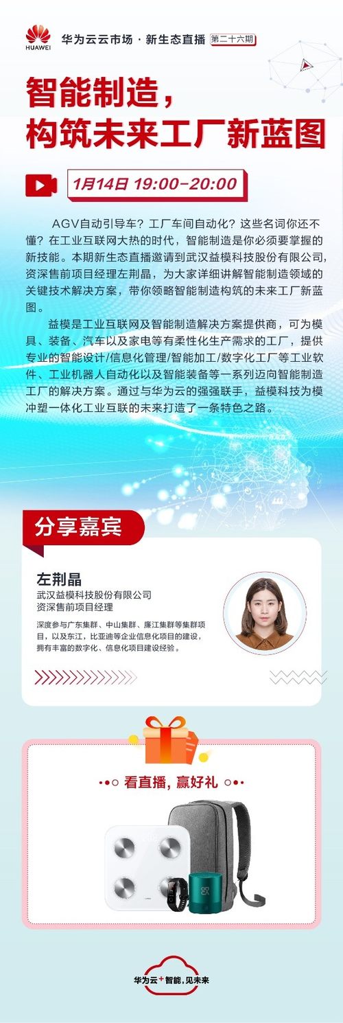 更多精彩,请锁定【华为云云市场 • 新生态在线直播】第二十六期《智能制造,构筑未来工厂新蓝图》1月14日周四晚上19点开播。 观看在线直播请访问华为云官网,进入云市场,点击云市场直播间选择“新生态在线直播第二十六期——《智能制造,构筑未来工厂新蓝图》”进入直播。我们将为您带来一场见证智能制造工业互联新发展的盛筵!