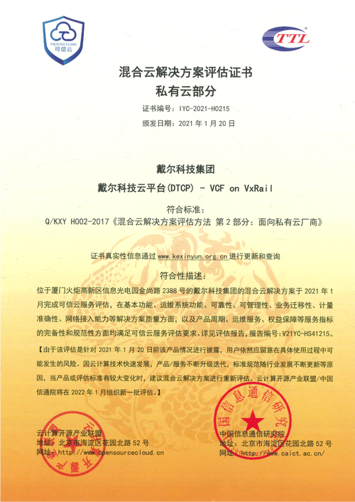戴尔科技云平台(DTCP)-VCF onVxRail获得混合云解决方案评估证书及可信云认证
