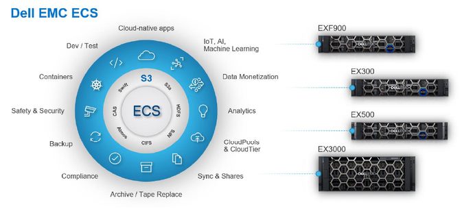 据介绍,ECS的硬件一体机目前已经进入第三代,即EX系列,其基石是作为ECS前身的Dell EMC Centera和Atmos对象存储平台。ECS EX系列由四款独特的硬件产品组成,即EX300、EX500、EX3000和全闪存EXF900。