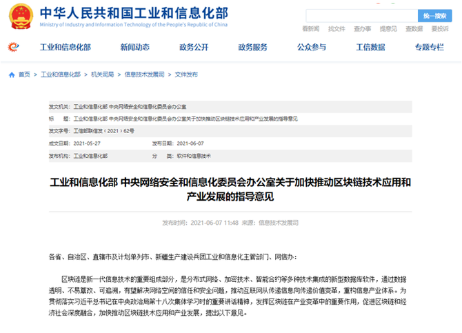 6月7日,《工业和信息化部 中央网络安全和信息化委员会办公室关于加快推动区块链技术应用和产业发展的指导意见》(以下简称《指导意见》)正式对外发布。