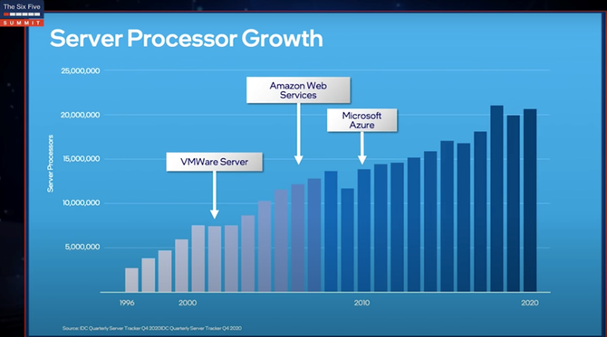 自90年代推出标准大容量服务器以来,服务器市场不断增长,直到2000年代初,在那个时间段内我们看到了虚拟化的发明,vmware为x86服务器创建了这个概念,它们通过将更多机器虚拟化到一台机器上来,使IT专业人员能够更好地利用物理资源,这当然有助于减少停机时间,并提高控制和安全性。
