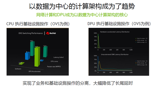 NVIDIA网络事业部亚太区市场开发高级总监宋庆春表示:“DPU的出现为以数据为中心的计算架构提供了非常创新的思路。以OVS操作为例,当我们run OVS在CPU上,会消耗很多CPU的核,但运行OVS的效率非常低,如果要把OVS操作放在DPU上可以把这个包转发率大幅度提升,而把CPU利用率大大地降低。”