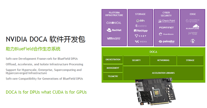 据了解,DOCA软件开发包是专门为DPU开发的软件包。它的价值就像CUDA对GPU一样,通过CUDA可以看到所有GPU的开发接口,可以对它做编程。