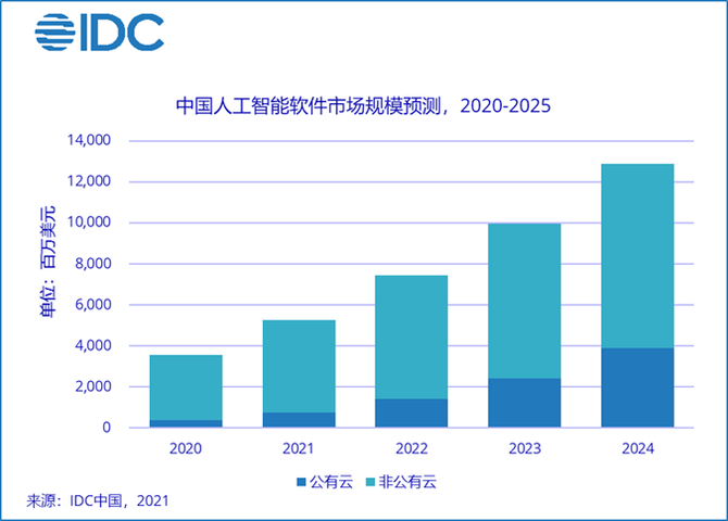 近日,IDC于2021年6月发布《中国AI公有云服务市场研究报告-2020》。报告显示:2020年中国AI公有云服务整体市场规模达24.1亿元人民币,占比整体AI软件市场10.4%。预计到2025年,中国AI软件市场公有云服务占比将达到36.1%。