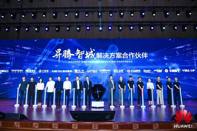 华为与云天励飞、安擎、云从科技、宝德、芯翌科技、黄河、千视通、华鲲振宇、极视角、神州鲲泰、文安智能、以萨技术、中科弘云共同发布了昇腾智城解决方案。昇腾智城是面向智慧城市,通过人工智能加速视频分析,帮助城市治理更聪明、更精细化的解决方案。