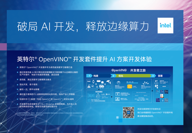 此外,随着智能化进程不断演进,越来越多的城市管理应用逐渐开始需要人工智能和视觉处理来提升城市管理的效率和准确性。英特尔是开源项目重要支持者, 早在三年前就推出了针对高性能、深度学习推理的OpenVINO工具套件(其中包括英特尔深度学习部署工具包,以及OpenCV和OpenCL的标准CV库及优化调用),帮助开发者实现高性能计算机视觉及开发。该套件能够借助高性能、人工智能和计算机视觉推理,方便快捷地将更快更准确的真实结果产品化,并在从边缘到云的英特尔架构上进行部署,以破局AI开发,充分释放边缘算力。去年5月,英特尔还携手开发者正式创办OpenVINO中文社区,且基于此成立了OpenVINO工具套件领航者联盟,这些举措不仅为开发者建立了一个交流学习的平台,还为AI的下沉和普及打开了一扇大门。