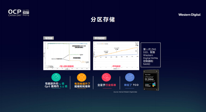 据刘钢介绍,UItrastar DC ZN540 ZNS SSD包括一个垂直集成的双端口、高可用性NVMe控制器,以标准U.2尺寸提供了高达8TB的容量。作为新一代的SSD,UItrastar DC ZN540 ZNS SSD采用行业标准规范,适合多租户环境和一些以数据为中心的应用,例如用于事件流处理。这款硬盘具有更高的效率、利用率和扩展能力,同时降低了公有云和私有云基础架构的总体拥有成本。