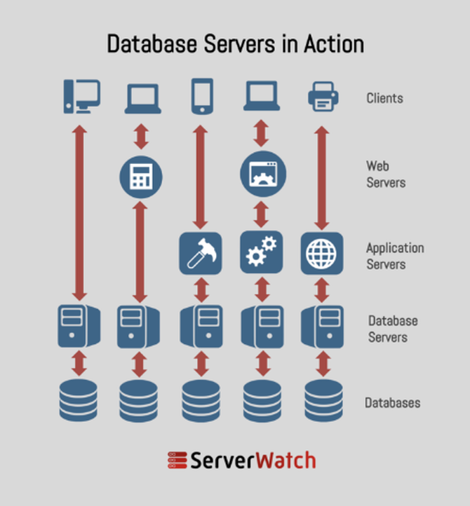 大多数数据库服务器在客户端-服务器模型上运行,接收来自客户端设备及其各自用户的请求,然后返回所需的响应。上图显示了数据库如何在为网络客户端提供资源方面发挥基础作用。