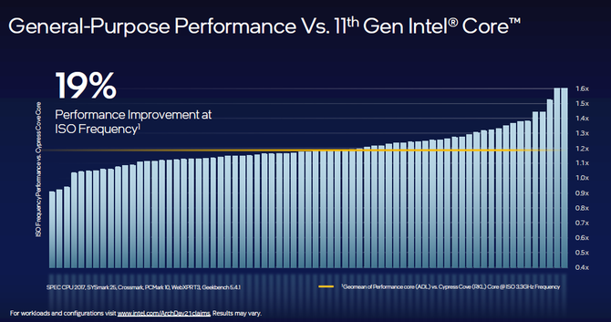 当然了,这种变化主要是为了提升性能,因为从英特尔官方报出的数据来讲,使用全新架构的平台,它的整体性能提升了19%,这是一个平均的成绩,但是以我对英特尔的一向谨慎作风的了解,我也有理由相信,其实许多的项目的成绩都会高于这个数字。