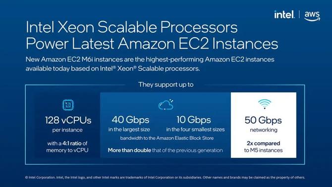 为M6i实例提供支持的第三代英特尔至强可扩展处理器,集成提供更高单核性能、内置人工智能加速的英特尔深度学习加速以及内置密码操作硬件加速特性,为客户带来了比M5实例更低的总体拥有成本。除了更高的工作负载性能外,为确保大规模可靠,第三代至强可扩展处理器还在集群规模上专门进行了验证和测试,以便处理不断扩展的各种云工作负载。