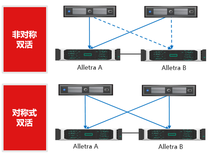 在“对称式双活”模式下,两地数据中心计划性运维/更新主动式切换可在1秒内完成,非计划停机/异常故障导致的被动式切换,可在10秒内完成切换。这样,无论是RAID失效/元数据损坏/链路故障时仍可保障业务不中断,数据不丢失。最后,Alletra还可根据用户环境不同在线转换双活模式(非对称式/本地式/对称式)。
