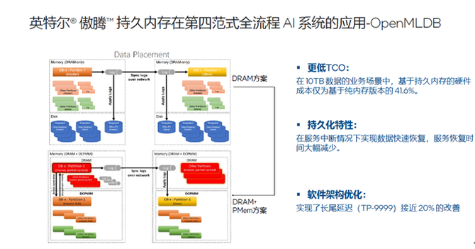 期间,英特尔技术专家还分享了第四范式如何应用英特尔傲腾持久内存加速AI应用。为构建高质量在线推理服务,第四范式基于自有的SageOne AI算力平台,引入英特尔®傲腾™持久内存,为企业用户打造了新一代HyperCycle Machine Learning全流程AI系统。一方面,得益于傲腾持久内存提供接近纯DRAM内存配置的性能,能够实现每秒亿级KV的查询能力;同时,傲腾持久内存具备数据持久性优势,能够使数据恢复时常缩短至分钟级,以更好地保障线上服务的连续性;此外,其更高的存储密度,能够大大降低内存资源的单位价格,帮助企业用户有效降低系统采购、部署、运维和管理等费用,大幅降低TCO。