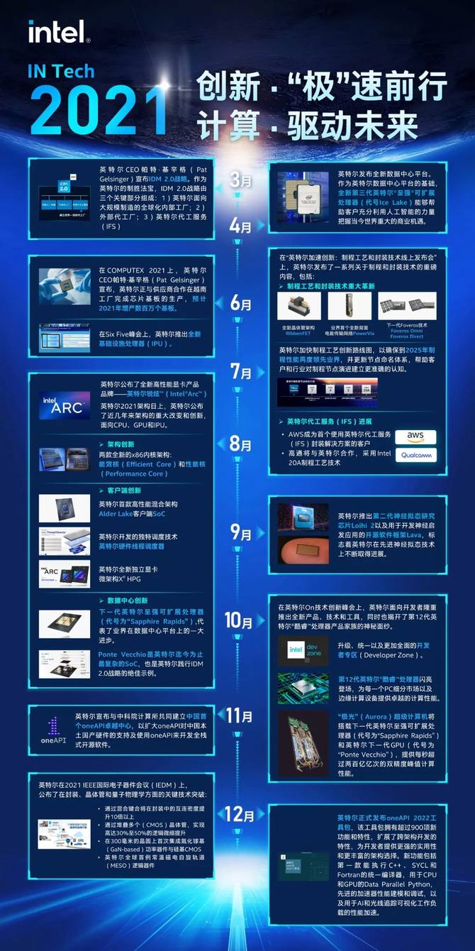 2021年,英特尔凭借在软件、芯片和平台、制程和封装以及大规模全球制造商的独特优势,推动异构计算,并通过四大超级技术力量——无所不在的计算、从云到边缘的基础设施、无处不在的连接、人工智能,驱动数字化未来。英特尔正持续释放硅的神奇力量,为数字世界构筑基石。