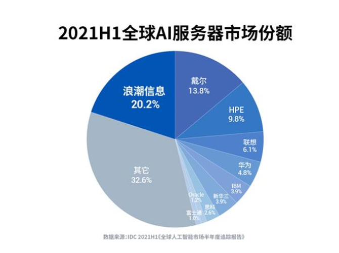 在2021H1全球AI服务器市场中,浪潮信息、戴尔、HPE分别以20.2%、13.8%、9.8%的市占率位列前三,三家厂商总市场份额占比达43.8%。