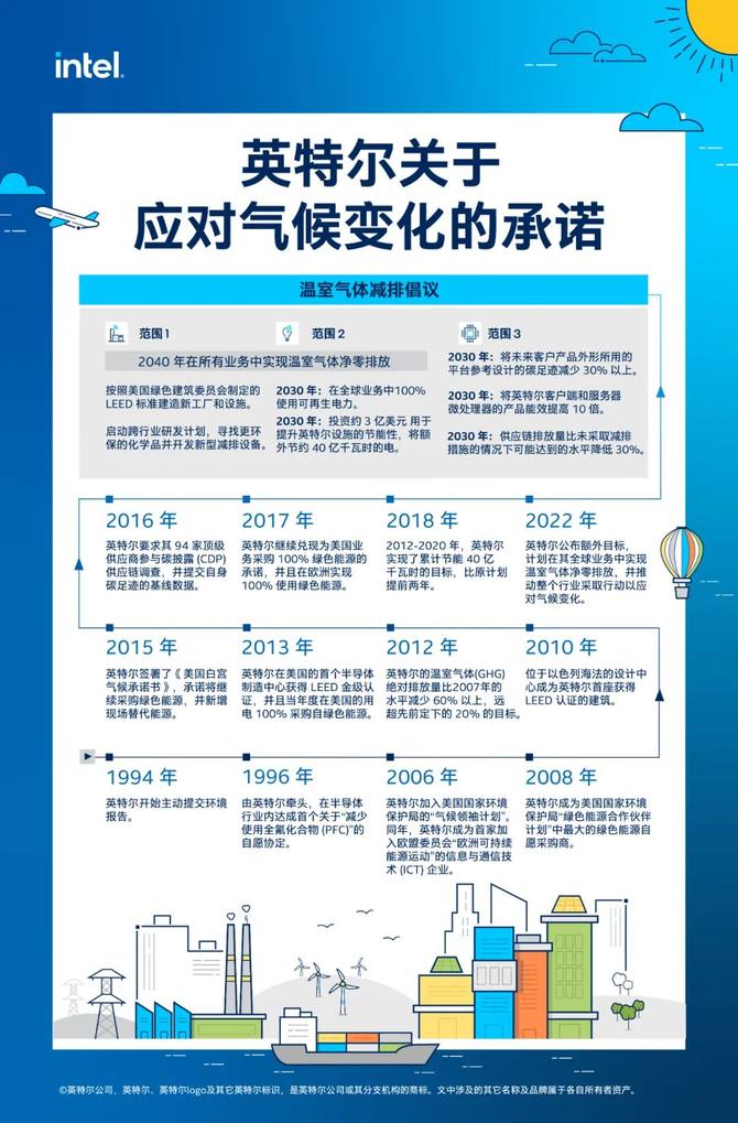 英特尔承诺在2040年前,在整个运营过程中实现温室气体净零排放(也就是所谓的范围1:直接排放和范围2:间接排放)。英特尔的首要任务是遵循国际标准和气候科学,积极减少排放。只有在穷尽其他选择后,英特尔才会使用可靠的碳补偿来实现其目标。
