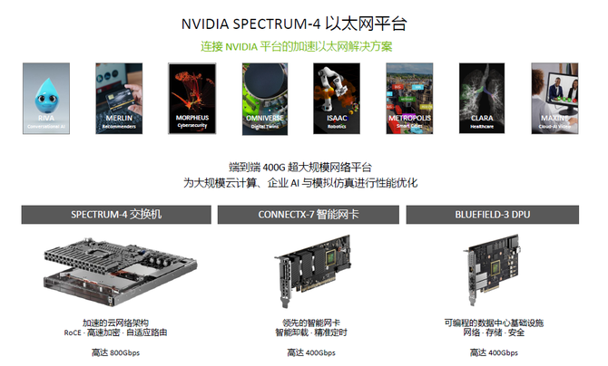 那么,它有哪些过人之处呢?据了解,作为全球首个400Gbps端到端以太网网络平台,NVIDIA Spectrum-4的交换吞吐量比前几代产品高出4倍,达到51.2Tbps,能够大幅加速大规模云原生应用。