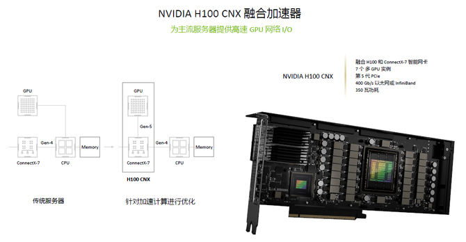 据了解,NVIDIA为了将Hopper GPU的强大算力引入主流服务器,还推出了全新的融合加速器H100 CNX。它将网络与GPU直接相连,耦合H100 GPU与英伟达ConnectX-7 400Gb/s InfiniBand和以太网智能网卡,使网络数据通过DMA以50GB/s的速度直接传输到H100,能够避免带宽瓶颈,为I/O密集型应用提供更强劲的性能。