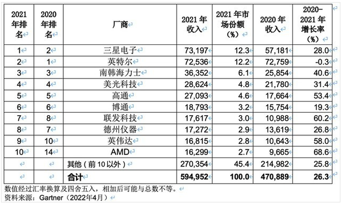 “这也导致中国在半导体市场的份额从2020年的6.7%下降到2021年的6.5%。受到存储器市场强劲增长的推动,韩国在全球半导体市场的份额达到19.3%,成为2021年市场份额增幅最大的国家。”