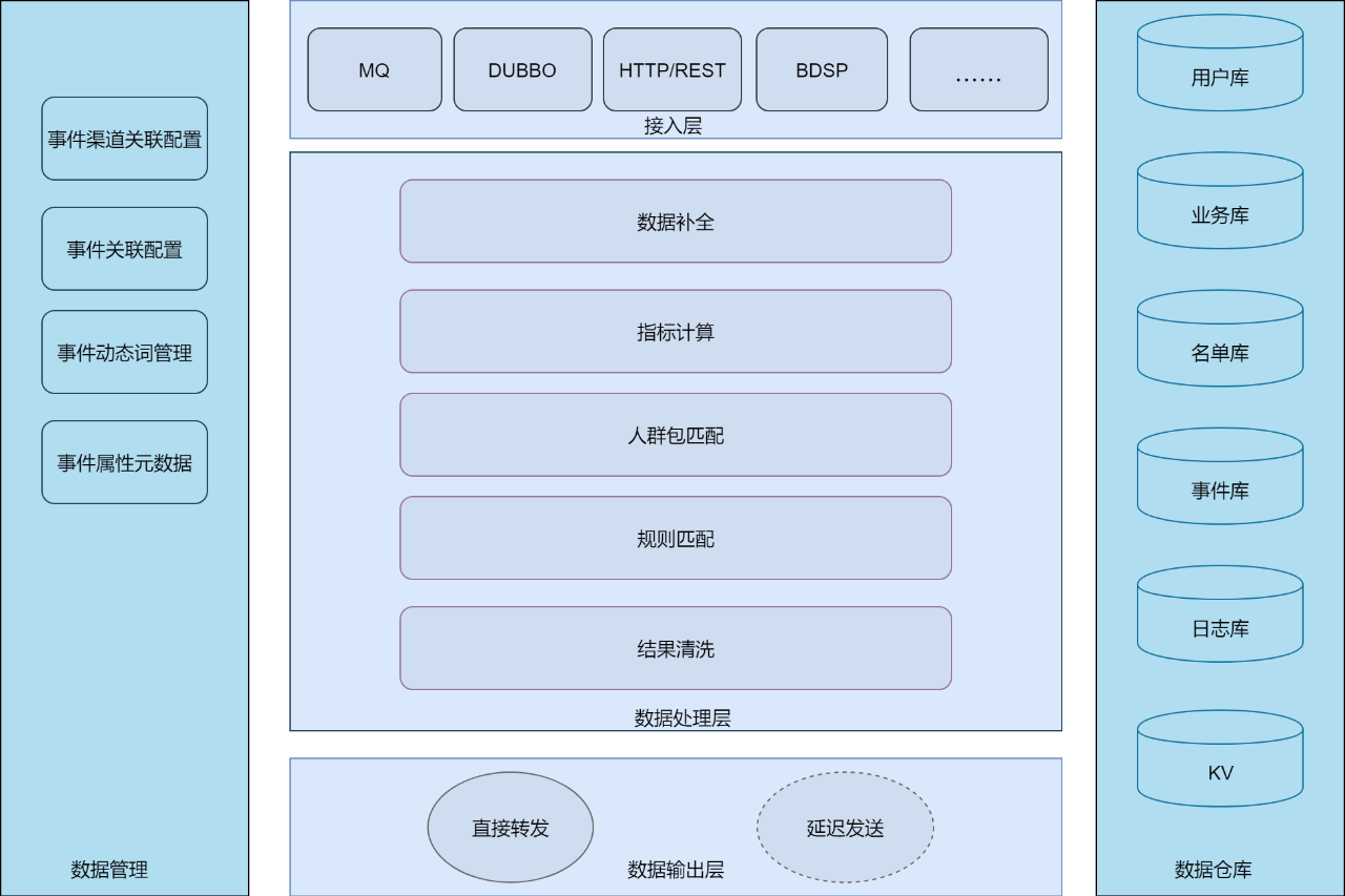 提供多种业务事件数据接入方式(比如支持异构外部系统的通用HTTP,内部的DUBBO、MQ等),最后转成MQ的方式统一分发。