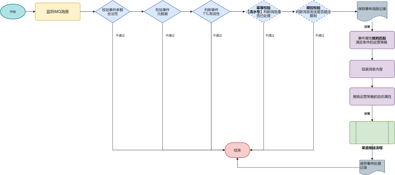 抽象公共分发模板:事件参数和有效性检测 → 分发到事件规则匹配器 EventMatcher → 输出到渠道发送流程