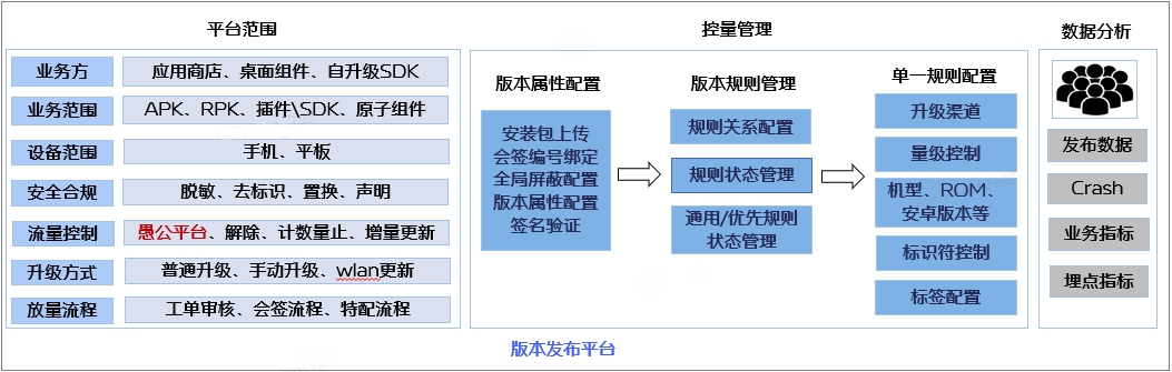 一方面,我们承接了“APK自升级”以外的很多升级能力,如各类组件、快应用、原子组件、SDK包、插件、SO库等等;另一方面,我们对下发规则做了更多兼容和细致的扩展,如量控量止、多维度正反交并差&分群、标识符分群、各种灰度策略、多语言、多渠道、全局规则、一键拦截、一键分析等等;此外,安全合规脱敏、降本增量算法、流控算法【愚公平台】、星云埋点质量分析、crash告警分析、发布趋势等也在vivo版本发布平台的附加价值之内。