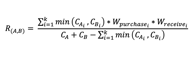 其中k表示两用户共同购买的商品数目,CA与CB分别表示对应用户购买商品数量,Wpurchase与Wreceive分别表示用户购买与收货相似度,并随着时间窗口与是/非大促期间自适应变化,R(A,B)越高表示用户购买相关性越大,对应建边权重越大,由此构建用户间购买关系。