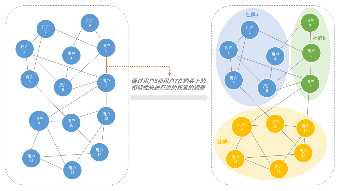 A:针对电商场景中具有团伙聚集性质的众包黄牛购买行为,我们利用社区发现算法建立了电商异常社群发现模型,通过用户与其购买的商品之间的关系建边,构建用户与用户之间的二部图。在模型的建立过程中我们使用数据预处理过滤了对模型影响较大的异常数据,并使用自定义距离算法来量化用户之间在购买上的相似度: