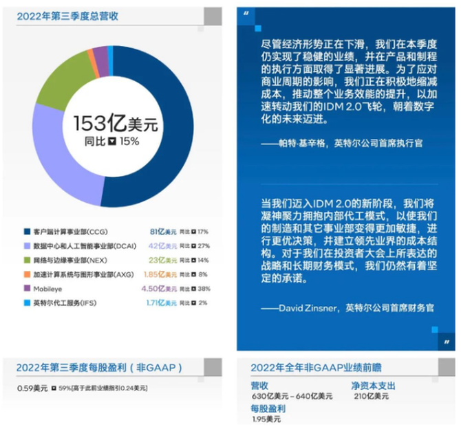 英特尔首席执行官帕特·基辛格表示:"尽管经济形势正在下滑,我们在本季度仍实现了稳健的业绩,并在产品和制程的执行方面取得了重要进展。为了应对商业周期的影响,我们正在积极地缩减成本,推动整个业务效能的提升,以加速转动我们的IDM 2.0‘飞轮’,朝着数字化的未来迈进。”