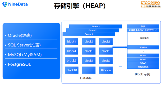 常见的数据库,像Oracle,SQL Server,MySQL(ISAM),PostgreSQL表的基础结构都是堆表引擎。可以理解为一条记录过来,就把它按先后顺序堆进去。数据库由多个文件构成,一个文件由多个Extent/Segment构成,每个Extent包含多个Block/Page,OLTP通常在4K~32K大小,Block里面就是具体的行数据信息。
