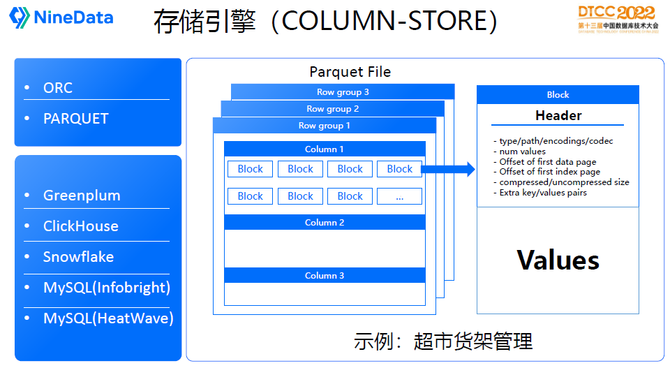 开源的ORC和PARQUET是列式存储的典型模型,都比较常见。Greenplum、ClickHouse等数据仓库都支持列式存储。