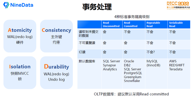 Durability:持久性,意思是事务提交后,数据库一定要确保生效,即使操作系统重启或者是服务器掉电。数据库通常也是使用WAL加硬件的持久性来实现,这里需要保证commit后刷盘立即写入,不能临时缓存在内存中,否则服务器掉电就丢失数据。