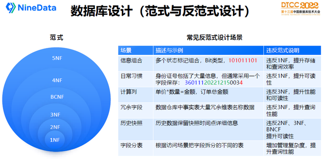 接下来讲一下数据库的设计,基础知识是要掌握范式,在教科书里面非常多,这里不多讲 。反范式我觉得是比较有意思,尤其是表设计里面,有非常多的反范式的案例。比如说标记组合是比较常见的,如果有多个标记状态位,可能会用bit的数据类型去存储,这其实就已经违反了第一范式,因为第一范式要求字段的内容要原子性,不能拆分。实际上数据库内核里面,它用了很多bit类型这种反范式来设计元数据,从而提升存储和查询效率。