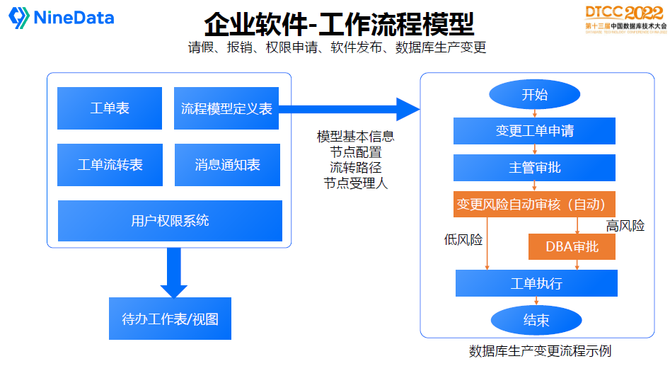 然后是流程模型定义表,例如数据库产生变更的流程,现在做生产发布,变更表结构,要提交变更申请,主管要审批,如果高风险还需要DBA的审批,这就是一个业务流程模型。