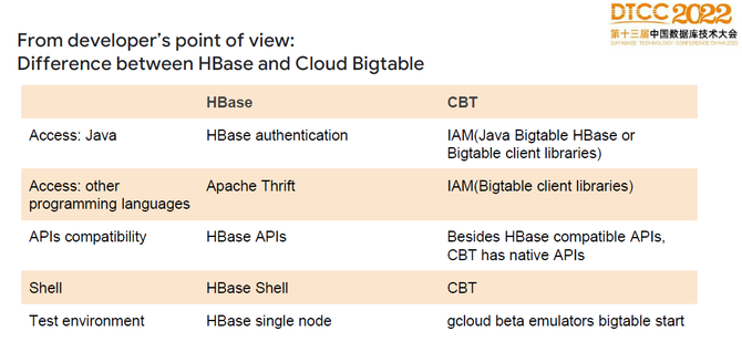 对于开发者来说,使用它们两者有哪些区别呢?Bigtable是云原生数据库,它使用的IAM认证。
